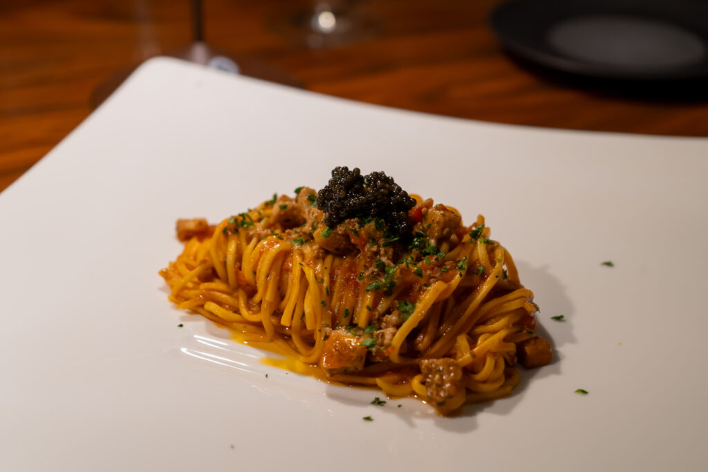 Tagliolini al ajo, aceite de oliva y peperoncino con pez espada y caviar Oscietra.