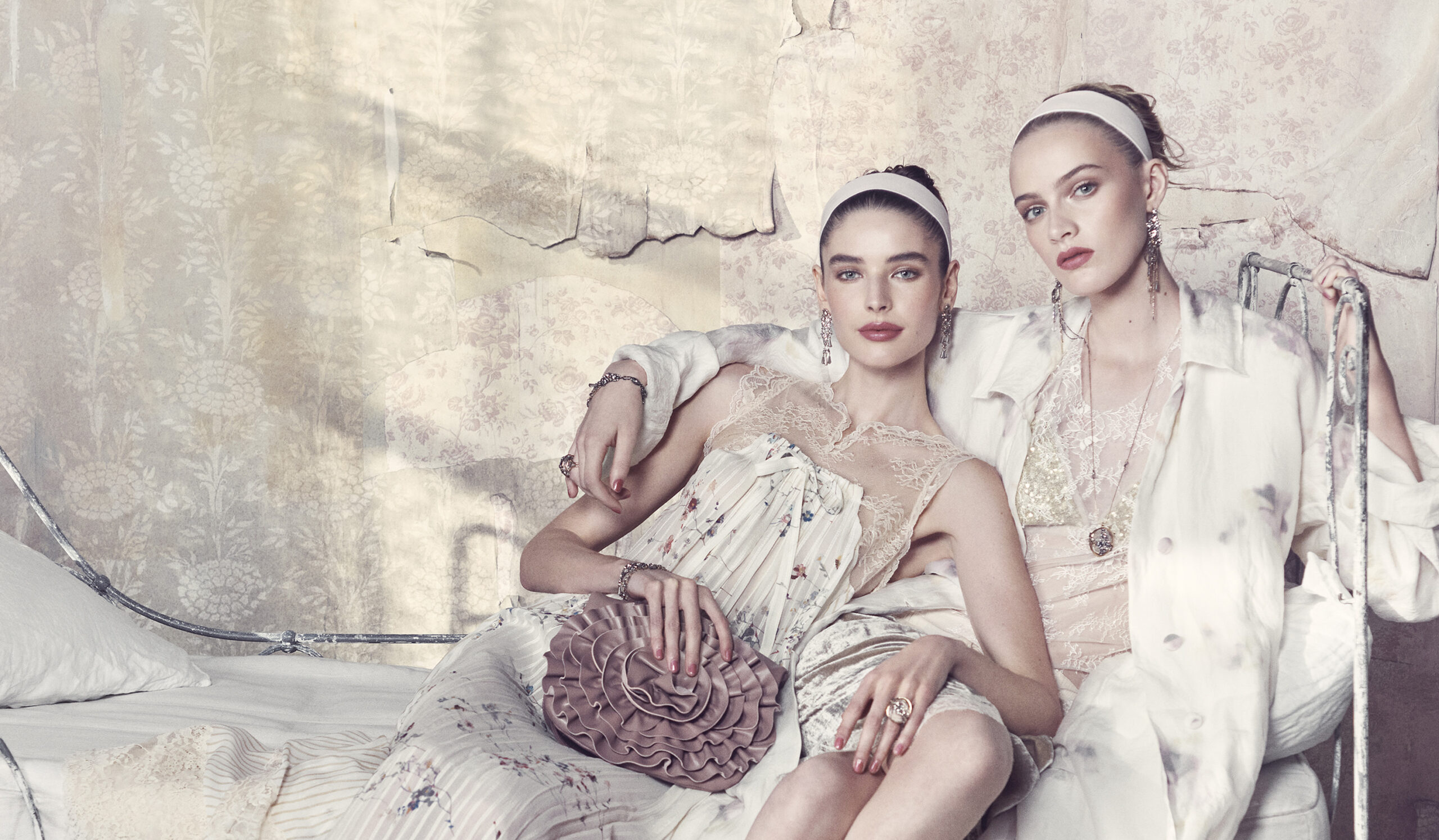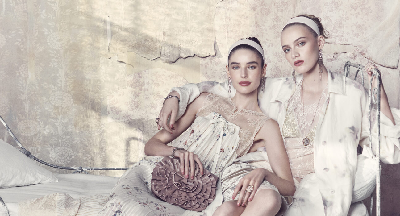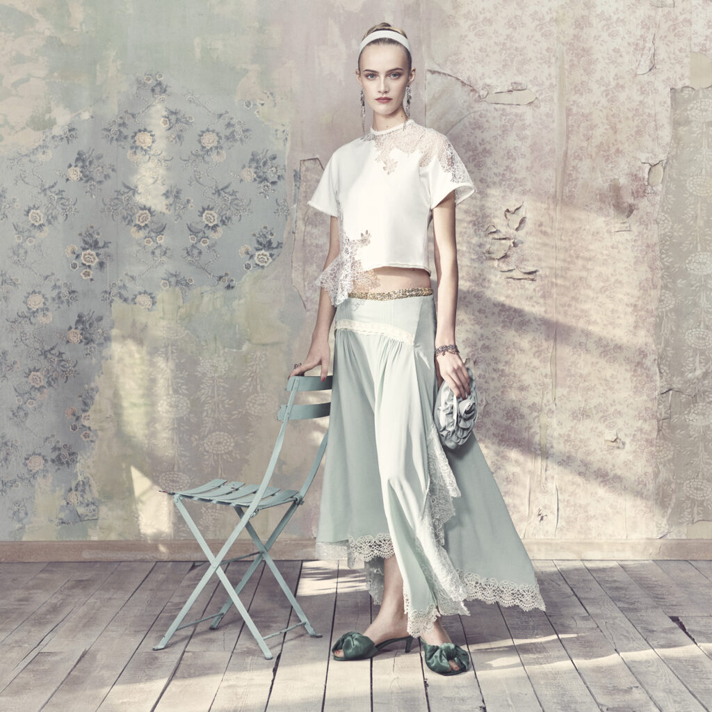 A lo largo del armario, las prendas familiares se recomponen. Los vestidos lenceros caen de forma asimétrica con godets de encaje; los conjuntos de rayas se suavizan con camisolas transparentes; los abrigos largos de tweed con dobladillos deshilachados se superponen sobre pantalones florales; y el punto transparente se lleva sobre camisolas y vestidos lenceros. Los accesorios repiten el mismo lenguaje de la colección: mules de satén con lazo en la puntera en tonos rubí, verde azulado y mostaza; bolsos tipo clutch con rosetones fruncidos; pendientes largos de cristal; y diademas blancas que destacan sobre una paleta sutil de colores pastel.